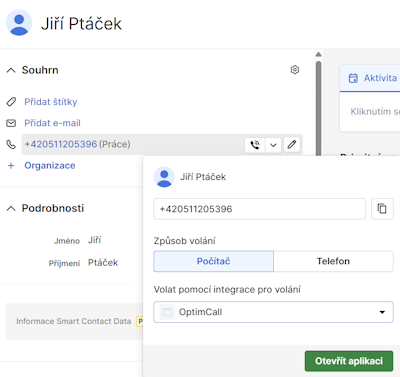 Každá aktivita se automaticky přiřadí ke správnému kontaktu v Pipedrive podle telefonního čísla. V případě neznámého čísla může OptimCall nejprve automaticky založit nový kontakt.