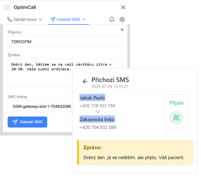Propojení s ústřednou OptimCall přináší do Pipedrive možnost pohodlně odesílat SMS zprávy přímo z prostředí CRM – bez nutnosti přepínání do jiných nástrojů. Využijete je například pro potvrzení schůzek nebo rychlé odeslání informace klientovi.