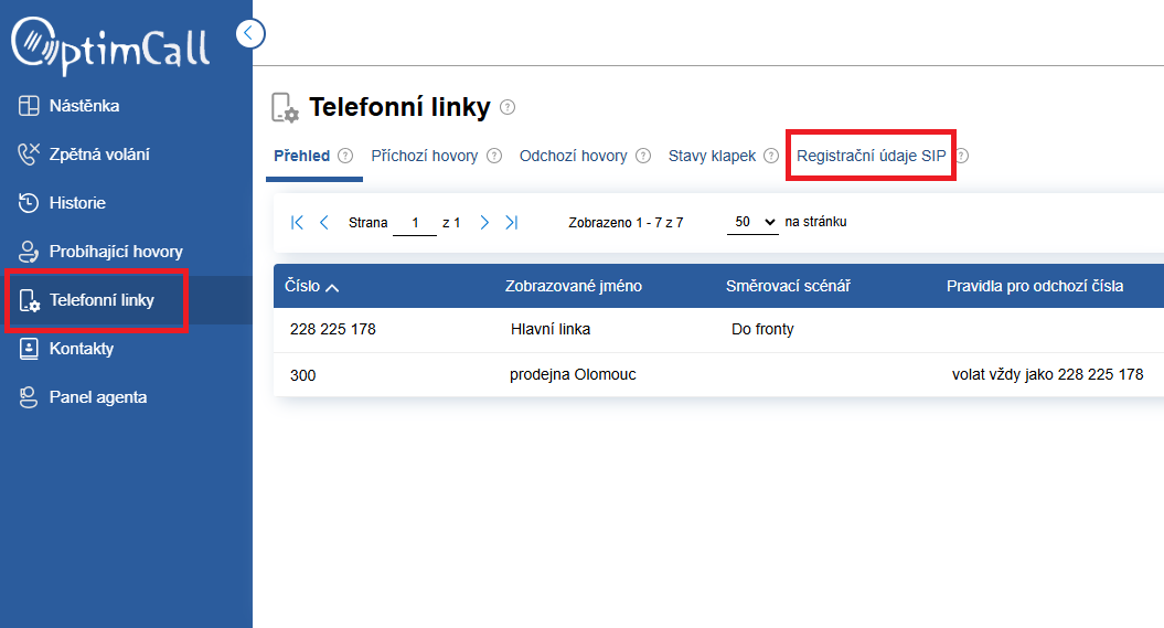 Přihlaste se do svého účtu OptimCall a v levém menu klikněte na Telefonní linky (Phone lines).