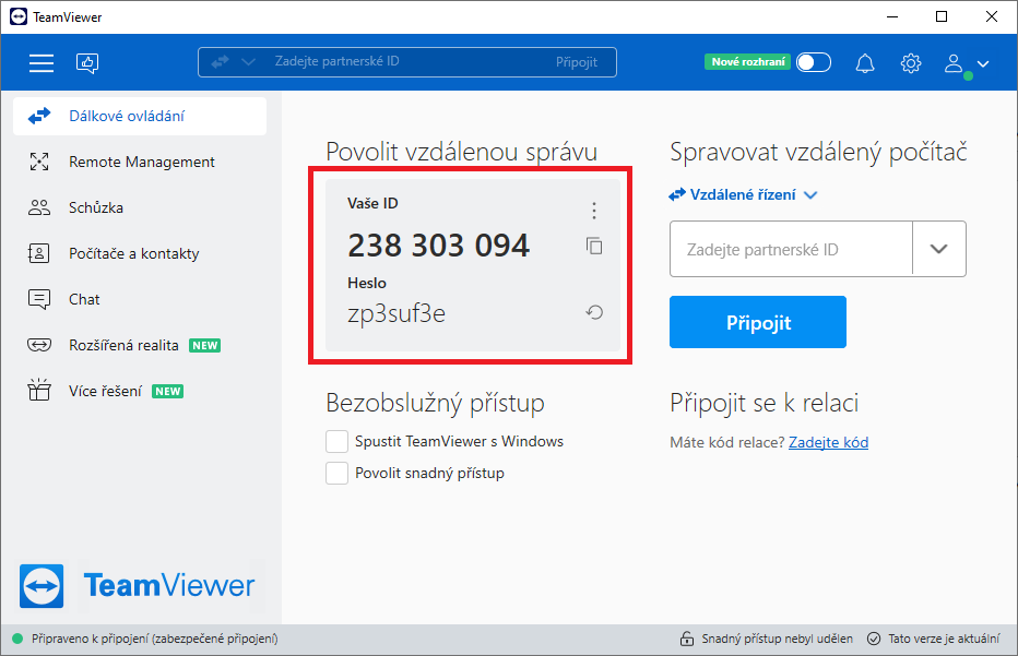 Pokud máte vše ke vzdálené pomoci připraveno, spusťte program TeamViewer. V dolní části okna by se mělo zobrazovat Připraveno k připojení (zabezpečené připojení). Poté nám zavolejte a nadiktujte vaše ID a heslo.